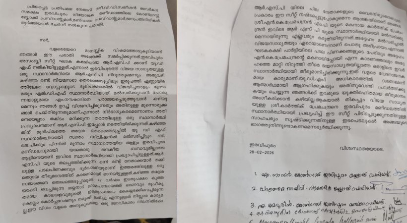 ഇരവിപുരത്തെ ആർഎസ്പി സ്ഥാനാർഥിക്ക് വിജയസാധ്യതയില്ല; വി ഡി സതീശന് കത്ത് നൽകി കോൺഗ്രസ്, യുഡിഎഫിൽ ഭിന്നത
